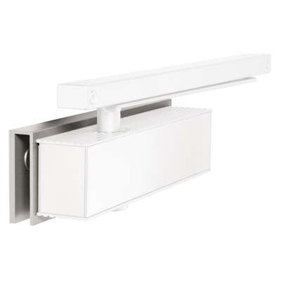 Hydraulische deurdranger met glassteun voor automatische sluiting en lage openingsweerstand.