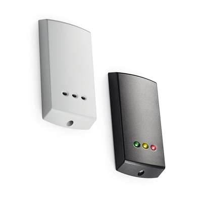 Leest Mifare Classic® (ISO 14443A), MIFARE® CSN, Desfire EV1® CSN, Hitag1/2, EM4100 en Paxton kaarten; keuze zwart of wit front, laag profiel (<16 mm), IPX7, vervangbare frontjes gratis.